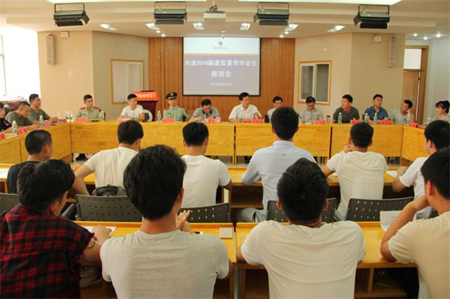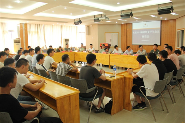座谈交流中,退伍复学毕业生分别分享了自己难忘的军旅生涯和充实的大学生活,介绍了参军入伍给他们带来的改变和成长,汇报了自己的就业升学情况和职业发展规划,表达了与母校之间的不舍之情,并为学校事业发展,特别是国防教育和征兵工作建言献策。报名参军的学生代表围绕“为什么要当兵,要当什么兵,怎样当好兵”等话题,纷纷交流了自己的看法,并表达出坚定的参军报国决心。
