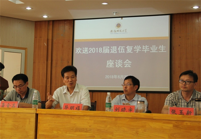 本网讯(人武部 蒋建伟)6月25日下午,学校在大学生活动中心三楼报告厅举行2018届退伍复学毕业生座谈会,校党委常委、副校长毕明福出席会议并深情寄语退伍复学毕业生,招生就业处副处长聂全高、学生处副处长张玉新,以及11名2018届退伍复学毕业生和今年报名参军学生代表参加座谈会,座谈会由学生处处长、人武部部长刘晓宇主持。