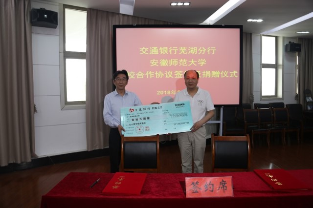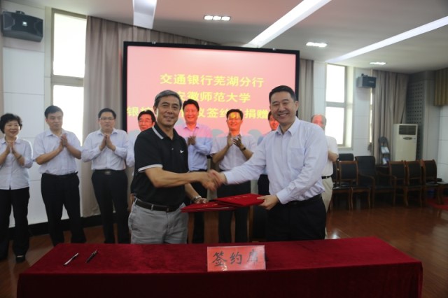 安徽师范大学党委常委、副校长朱家存教授和交通银行芜湖分行党委书记、行长王大坤分别代表双方在《银校合作协议》签字。