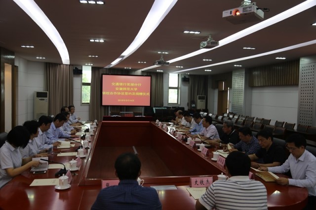 交通银行安徽省分行党委委员、副行长陈洪对安徽师范大学事业发展所取得的辉煌成就表示由衷的敬意。作为安徽建校最早的高校,安徽师范大学名师、名人辈出,成为近代安徽优秀人才、优秀师资的重要培养基地。今年正值交通银行成立110周年、安徽省分行成立30周年,交通银行安徽省分行始终发扬“诚交百年,融通天下”的优秀传统,秉承“一个交行、一个客户”的经营服务理念,紧密依托交通银行金融集团优势,以金融产品覆盖全面和科技手段专业先进的综合化业务体系,倾情服务地方经济,为安徽省及芜湖市经济持续健康发展做出了突出贡献。交通银行一直矢志不渝地支持安徽教育事业发展,此次银校全面合作协议在融资融信、移动缴费平台、智慧校园等方面开展全方位合作,意义重大,影响深远,是双方向更宽、更广、更深层次全面合作的新起点,是携手并进、共谋发展的新开端。交通银行芜湖分行将积极推进协议各项成果落地,发挥主流商业银行优势,通过授信业务、现金管理、投资银行、理财业务、私人金融服务等,为安徽师范大学提供全方位的金融服务和信息咨询,支持安徽师范大学的全面建设。