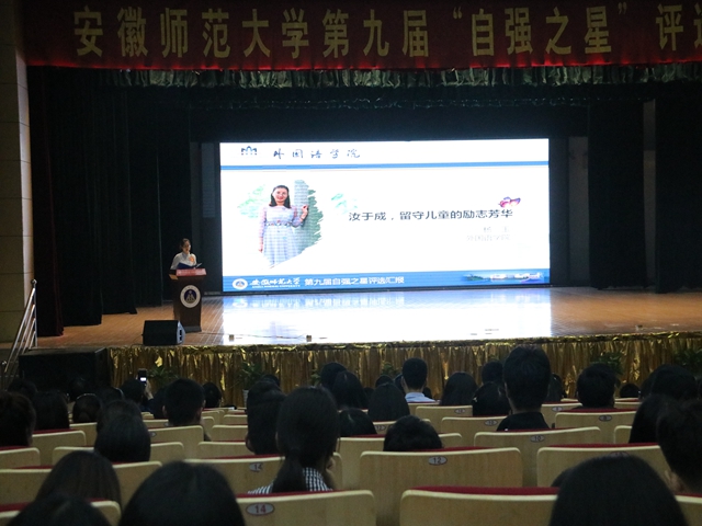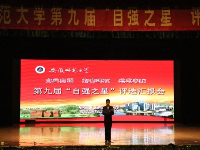 本网讯(学生工作处 项家春 金捷)“勤俭朴素,自立自强;勤者自助,达者自强”。4月25日晚上,校第九届“自强之星”评选汇报会在花津校区大礼堂隆重举行。我校“爱心助学”单位代表杨燕制药有限责任公司总经理李钦国、杨燕制药有限责任公司行政专员李俊、国元证券团委书记戴晴、国元证券团委副书记李东宇、精锐教育总监胡金保、精锐教育助理总监李妍昕、芜湖市人民银行办公室主任马勇、芜湖卷烟厂办公室吴珂、校教育基金会项目管理部部长郑金泽,我校副校长毕明福及评选委员会全体成员、各学院党委副书记、专业负责人代表、辅导员代表和贫困学生代表等800余人参加评选汇报会。评选汇报会由校第八届“自强之星”、安徽省优秀大学生、中国自强之星提名奖获得者、2014级地理科学专业穆萨艾力·多力坤同学主持。