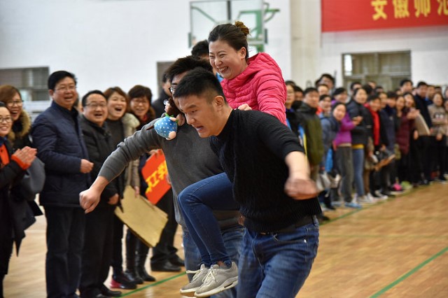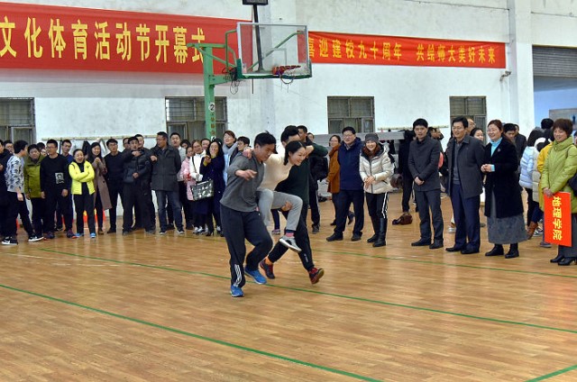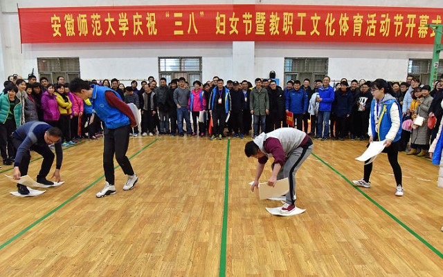 随后,趣味运动比赛开始了。比赛共由“和谐师大抬幸福”、“借桥过河新征程”两部分组成,26个分工会组成男女混合代表队依次参加比赛。整个过程紧凑有序、跌宕起伏,参赛选手们个个都表现出不凡的实力,他们身手敏捷,密切配合,动作娴熟,全力以赴,展现了良好的团队精神和竞技水平,诠释了团结就是力量;比赛既有紧张激烈的竞争,也有令人开怀的花絮,精彩纷呈,生趣盎然,虽然场馆外春雨潇潇,初暖乍寒,场内的人群热情却丝毫未减,喝彩、笑声此起彼伏,汇成了欢乐的海洋,为校园春色构筑起了一道亮丽的风景线,为“三八”妇女节增添了浓郁的喜庆色彩,缓解了教职工平日里繁忙紧张的工作压力,共同享受着运动带来的健康与快乐。