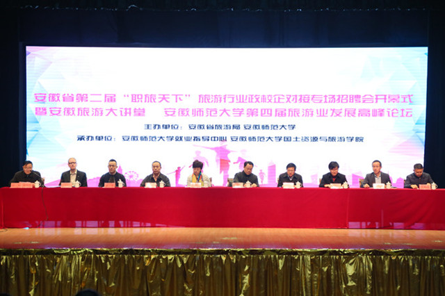 据悉,“职旅天下”系列活动的前身是由我校国旅学院于2013年底发起组织的主要面向院内毕业生举办的专场招聘会,经过四年的发展,该项品牌活动突破了起初学院层面单一的招聘会模式,提升为省级行业、学界和业界合作层面,体现“教学管一体化”思维,将“学业-专业-就业-行业”融为一体的复合式“招聘会+”模式。从初创时20余家企业、校内100余人参与的规模,发展到如今参会企业突破100家,提供就业岗位2000余个,覆盖我省16所旅游高校的千余位学子参会的规模。2015年3月,该活动首次正式创设旅游业发展高峰论坛;2016年3月,该项活动进一步优化结构、拓展功能、提升层次,活动的主办方首次升级为安徽省旅游局和安徽师范大学,由我校就业指导中心和国旅学院承办,活动升级为“政府领导、行业精英、学界专家、旅游专业学生”四位一体平台。今年在以往的基础上,大胆尝试创新,首次增设了安徽省旅游院校人才培养与就创合作院长论坛、安徽省旅游业政校企合作高峰论坛和安徽旅游大讲堂等活动,该项活动“就业招聘+专业建设+行业发展+人才培养”四位一体“招聘会+”的创新特色进一步彰显,已成为我校乃至全省旅游专业人才培养和就业工作的品牌,成为安徽省“起步最早、规模最大、影响最广”的高校旅游专业人才就业招聘和政校企合作对接“集散地”。安徽日报、芜湖电视台等媒体采访了本次活动。