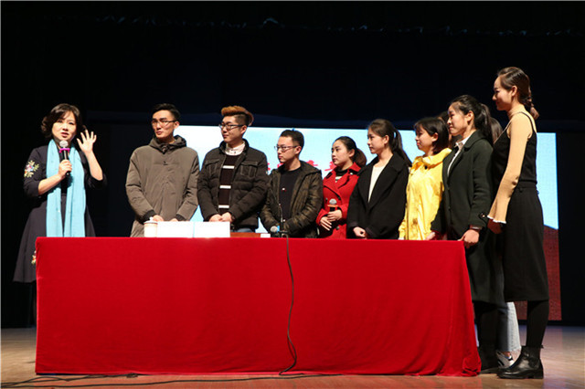 讲座中,鞠萍还邀请相关专业学子上台,亲自传授主持与采访的经验技巧。从最基本的话筒与手卡的使用方法到学会倾听他人说话内容,从让学生作为本场讲座的主持人模拟主持到巧妙情景再现出镜主持,坚持亲身实地教授,力求达到成果最大化。曾在合唱团任职的鞠萍,不仅身怀高超的歌唱技艺,而且对戏曲艺术如数家珍。在演唱黄梅戏《夫妻双双把家还》过程中,她与15级播音专业的殷武之间配合默契,韵味十足。鞠萍的才艺和举手投足间浑然天成的气场与台风,给新传学子上了最好的一课。