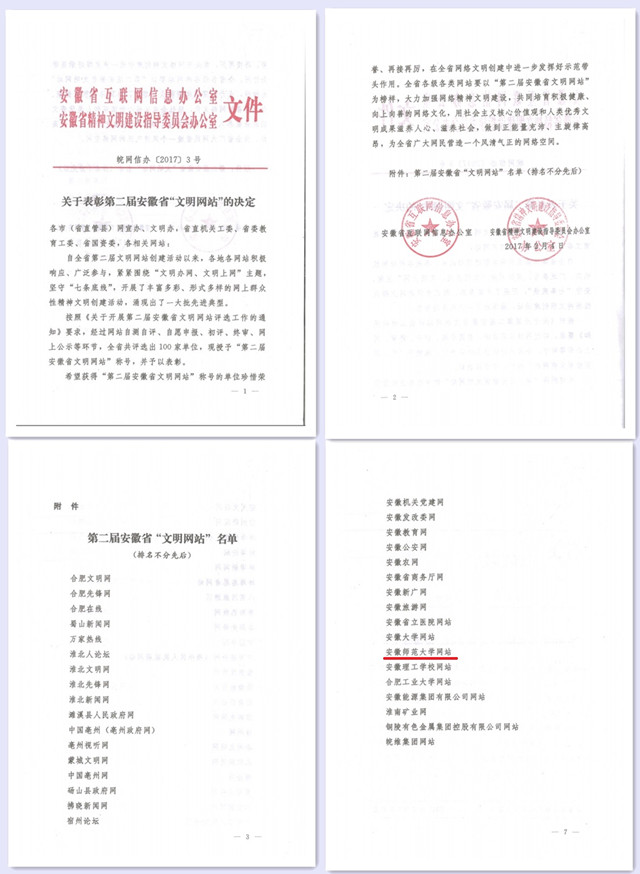 “安徽省文明网站”称号是互联网领域的省级荣誉,是反映互联网站精神文明建设、日常管理水平和社会责任的综合性奖项。此次评选标准涉及加强社会主义核心价值观教育、规范网站建设和管理、开展网络文明创建活动、净化网络文化环境、推动网站行业自律、提高网站文明服务水平等方面,经自测自评、自愿申报、初审终审、网上公示等环节,专家组最终评选出100家文明网站予以表彰(全省共有三家高校荣获这一称号)。