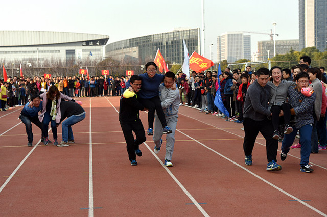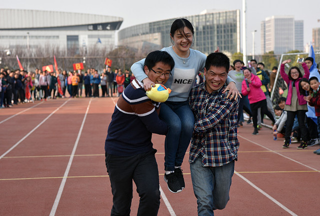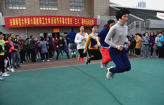 接着,“活力师大跳长绳”、“和谐师大抬幸福”趣味运动比赛项目在田径场展开。由各分工会组成的24支代表队参加此次比赛,他们满怀自信依次走进赛场。当比赛的哨声响起,赛场上顿时呈现出一片欢腾的景象,在紧张激烈竞争中、在一片欢笑喝彩与掌声中,比赛有序进行。“超越对手,超越自我”成为所有参赛选手的共同目标和信念;矫健的身姿,昂扬的斗志,凝聚着团结的力量。比赛既有紧张激烈的竞争,也有令人捧腹的花絮,精彩纷呈,充满乐趣,为“三八”节献上一道精神大餐,缓解了教职工平日繁忙紧张的工作压力,共同享受运动带来的健康与快乐。