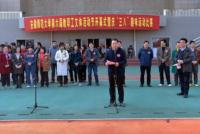 本网讯(文图 校工会 吴佑平)3月8日下午,春风和煦,阳光明媚。花津校区北侧田径运动场人声鼎沸,喜气洋洋,学校庆祝“三八”妇女节趣味运动比赛暨第六届教职工文化体育活动节开幕式在这里如期举行。校党委书记顾家山,校党委副书记李琳琦,副校长朱家存、毕明福,各学院、各部门负责人,各分工会主席、女工委员、运动员等欢聚一堂,共庆“三八”妇女节。