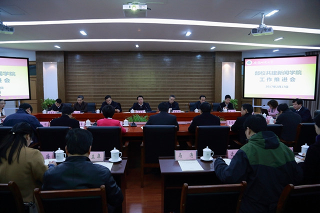 在随后召开的部校共建新闻学院工作推进会上,虞爱华指出,3年多来,部校共建新闻学院工作着力创新机制、改进教学、立德树人、加大投入等方面,取得了阶段性可喜成绩。他强调,要进一步深化完善部校共建“4+1”机制,着力抓实马克思主义新闻观教育这个根本、抓住新媒体下新闻传播研究这个重点、抓好实战性锻炼这个关键,实现部校共建持续性发展。