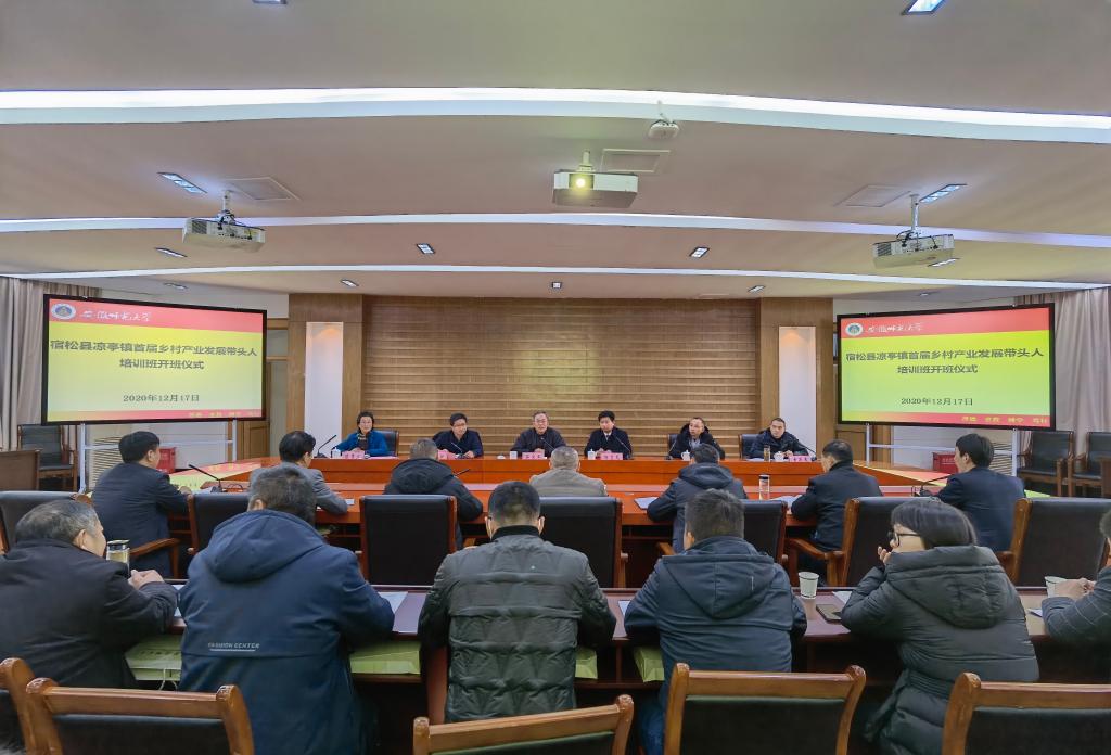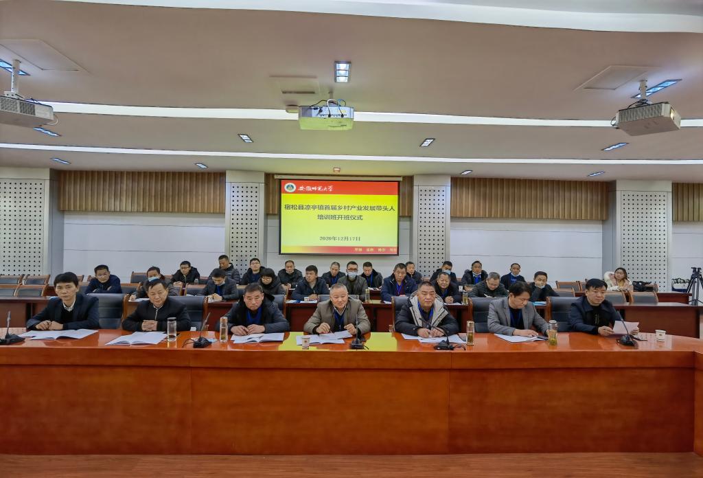 本网讯(文/桂晓骏 图/付勇)12月17日下午,宿松县凉亭镇首届乡村产业发展带头人培训班在我校开班。校党委副书记蒋家平出席开班仪式并讲话。校党委常委、办公室主任曾黎明,经济管理学院党委书记陈秀庆,凉亭镇党委书记杨文龙、党委副书记严国旺,三德村党总支第一书记、驻村扶贫工作队队长黄德春及驻村扶贫工作队成员,凉亭镇25名乡村产业发展带头人参加开班仪式。开班仪式由曾黎明主持。