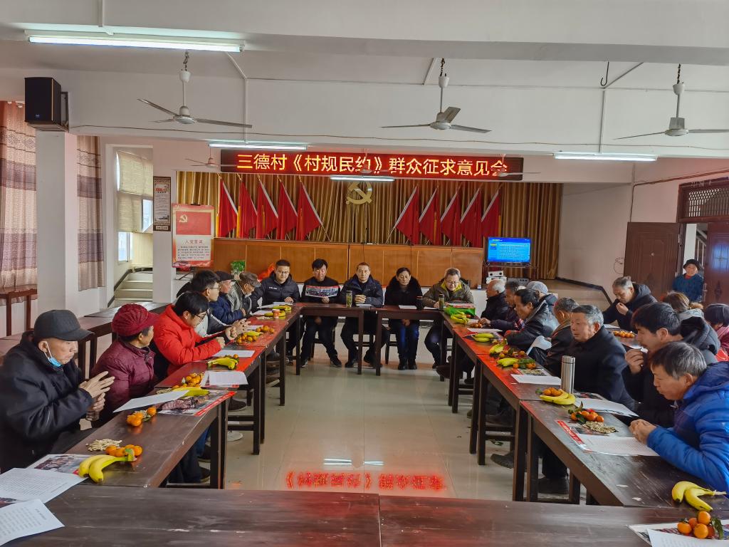 本网讯(文/桂晓骏 图/付勇)为提升帮扶成效,持续推进乡风文明建设,引导三德村群众树立积极向上的村风、民风,驻村扶贫工作队近期草拟了新的《三德村村规民约》,并于1月6日召开群众征求意见座谈会。三德村党总支第一书记、驻村扶贫工作队队长黄德春,副队长桂晓骏,扶贫专干付勇,三德村“两委”全体成员,第一届和第二届“三德奖”获奖人员共50余人参加会议。