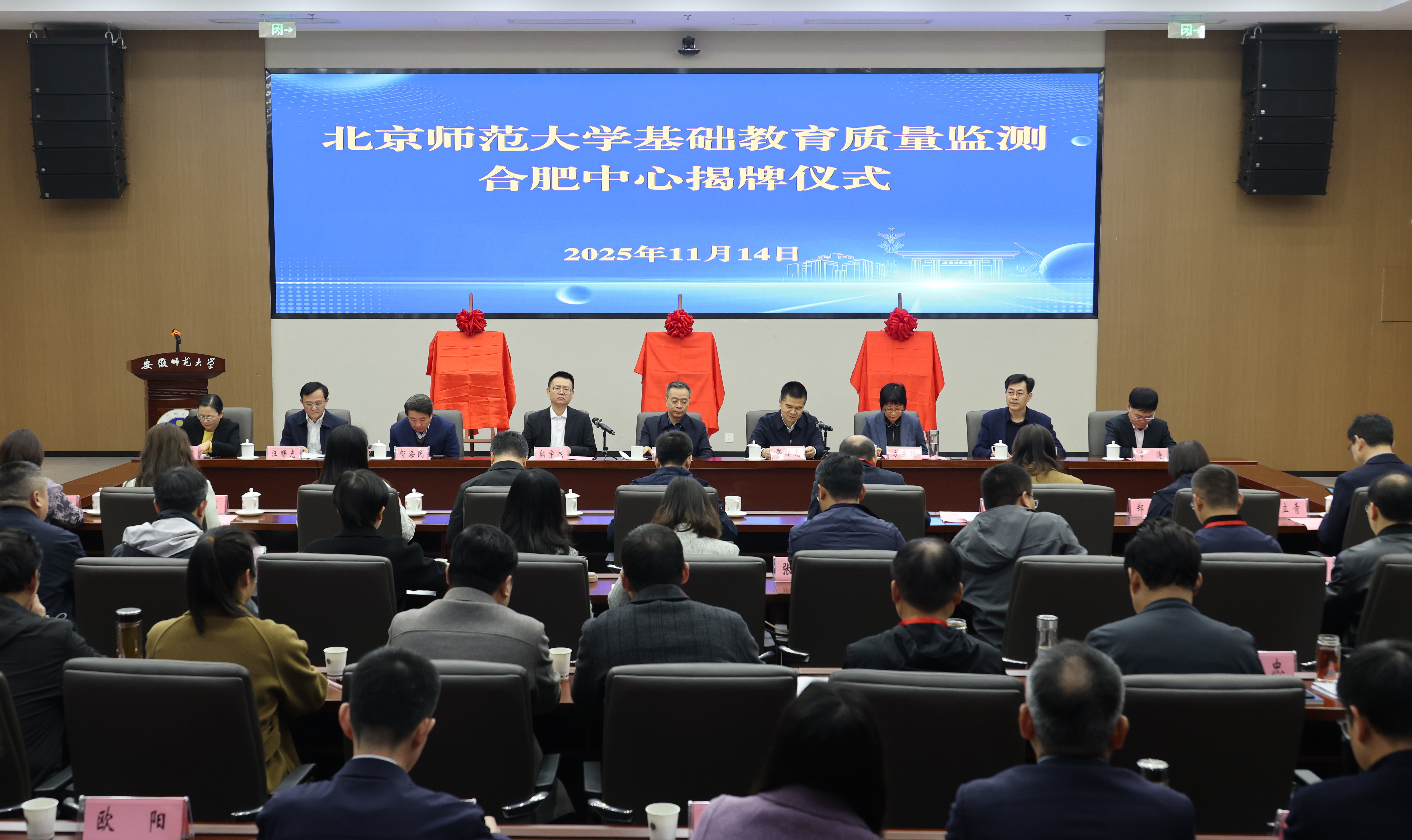 在热烈的掌声中,与会领导共同为北京师范大学基础教育质量监测合肥中心、北京师范大学基础教育质量监测合肥中心安徽师范大学分部、北京师范大学基础教育质量监测合肥中心合肥师范学院分部揭牌。